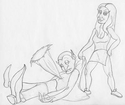 Below are two illustrations that I didn't show to Tonya. The one immediately below I feel is an accurate representation of the entire ordeal. There's that sleazy sinister-looking creep using this girl's image like a puppet and then there's me, just a dunce with a boner. Of course, "dunce with a boner" is a pretty apt description of every single male that is, has been, and will be on the planet. Am I right ladies?